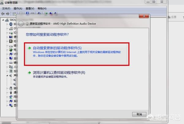 5、然后选择第一栏的“自动搜素更新的驱动程序软件”,按提示进行更新。这样就能更新win7电脑声卡驱动。