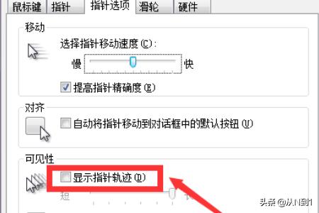 6、进入之后便会发现所出现的新界面里有一个‘显示指针轨迹’的选项,这个选项就是用来选择隐藏或者显示鼠标指针轨迹的。