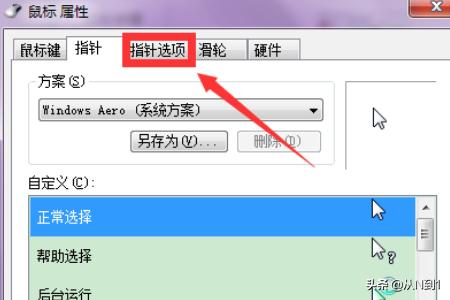 5.之后便会出现一个鼠标属性的对话框,会发现上边有一个指针选项,移动鼠标至此后单击鼠标左键,选择指针选项,具体操作如下所示