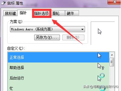 5、之后便会出现一个鼠标属性的对话框,会发现上边有一个指针选项,移动鼠标至此后单击鼠标左键,选择指针选项,具体操作如下所示: