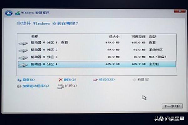 5、【以下图为例】前三个不足1G容量的分区都是隐藏分区。系统安装好之后,系统不会显示这三个分区。我们只能通过输入指令手动挂载这些分区或者用硬盘分区软件查看时,才能看到这三个分区的内容。第4个分区容量最大,就是用来安装系统文件的。选择第4个分区,点击“下一步”。