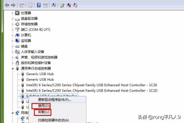 2、如图更新没用,同样是右击对应的选项,然后禁用,接着再启用,如果还不行就直接点击卸载,然后重启电脑,usb会自动重新识别,一般这样做简单的问题就可以解决了。