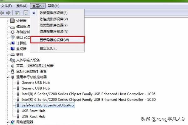 3、如果不能解决问题,接着还是回到设备管理器的界面,选择菜单栏的查看选项,在弹出的列表选择显示隐藏的设备,然后通用串行区域就会灰色的的选项显示,把这些全部卸载掉。