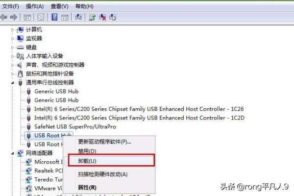 5、如果还不行,就把所有名称是usb root hub的选项,右击全部卸载掉,然后重新启动电脑,电脑会重新自动识别,这也算是一个大招了,多数的问题都能解决了。