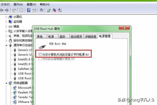 4、如果还不行,接着点击usb root hub的选项,应该是右击,然后选择属性,接着选择电源管理,把允许计算机关闭选项前面的勾取消掉,然后点击确定,当然是所有这个名称的选项全部操作一遍。