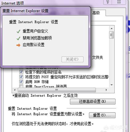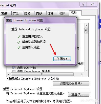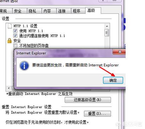 6.现在有一个提示说要重启浏览器才能完成重置,点击确定,然后关闭浏览器,再次打开,问题就会解决了。
