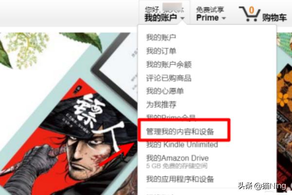 1、电脑打开亚马逊网站进入并登陆个人的账号,在我的账户下方,选择管理我的内容和设备的选项。