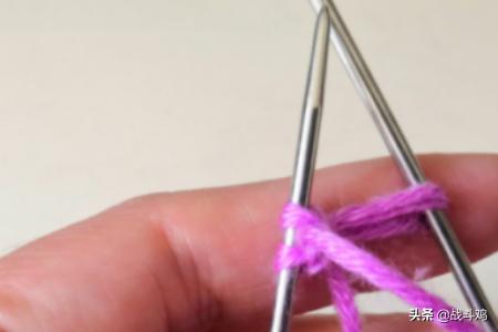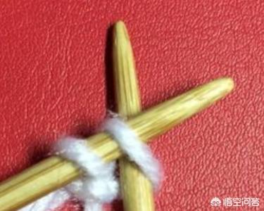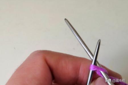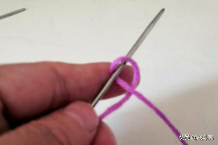 2、然后在右手的毛衣针上绕线,并将线从左手毛衣针的线圈里面穿出来,然后在套在左手的毛衣针上面,拉紧线头,这样起了1针,见下图展示。