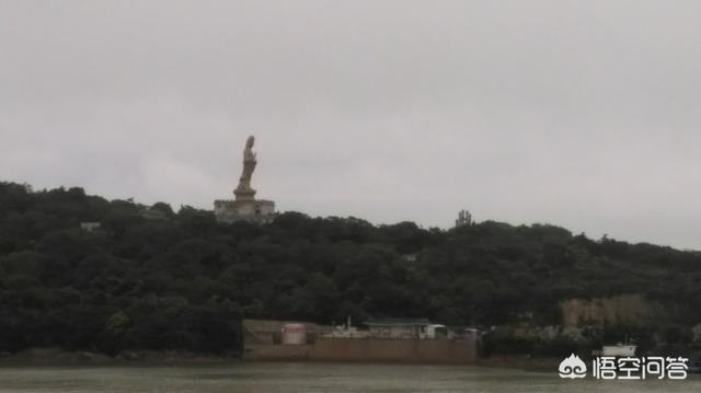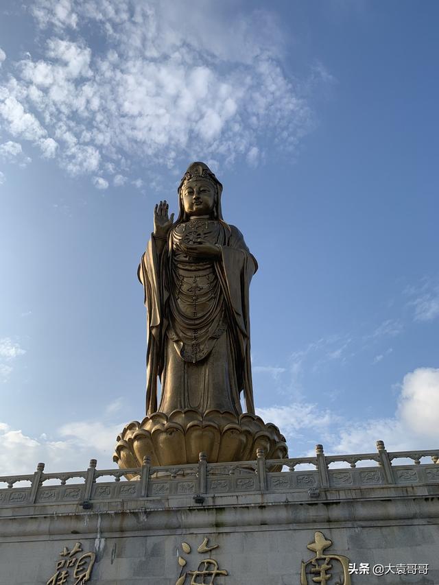 普陀山乃是中国四大佛教名山之一:安徽九华山、山西五台山、四川峨眉山、浙江普陀山。坐落于舟山群岛的岛屿上,每当节假日游客络绎不绝,来这里的人大多不是主要以游玩为主都是带着心愿来的,据说很灵验而且只要如愿了就要连续来三年还愿。我身边就有去过如愿的朋友而且每年都会去一次,也许有人会说这是封建迷信,怎么说呢这东西信则有不信则无。虽然我也去过许愿没能如愿但是我还是每年都会去一次。 2 普陀山上共有三大寺: 普济禅寺 、法雨寺、慧济寺 ,只要来请愿 的必去这三大寺,当然还有多个风景不错的景点就不一一介绍了,来主要介绍下题主问的南海观音:南海观音乃是普陀山的镇山之宝,它建于1996年 立像台座三层,总高33米,其中佛像18米,莲台2米,台基13米,台基面积为5500平方米。佛像顶现弥陀,左手托法轮,右手施无畏印,,体现了观世音菩萨“慧眼视众生,弘誓深如海之法身”。 佛像采用新型仿金铜精铸,为普陀山增添了新的人文景观,成为海天佛国的象征。“千处祈求千处应,苦海常作渡人舟”的观音大士,是世上佛教信众的信仰核心。“南海观音慈悲大千,普陀新景光照千秋。” 3 据说这里还发生过传奇的事,就在南海观音刚建成揭开面纱的时候天上突然显现出白色观音立姿圣象,在场人员无不狂欢鼓掌。舟山地处海边浙江又是每年台风多发地,每当台风来临时这里就要停船闭岛。但是奇怪的是每次台风路来临即将登岛时就会突然的改变风向绕过普陀山。