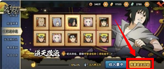 步骤/方式1打开火影忍者活动页面,点击佐助送十连活动步骤/方式2点击右下角的逆天改运,查看活动内容步骤/方式3了解互动内容后点击右下角我要逆天改运即可。...